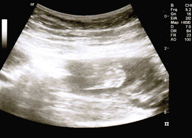The ultrasound tech told us that our little one looks perfect, is about 10 ounces, and has a very strong heartbeat of 153 beats per minute. She also mentioned that I have an anterior placenta which explains why I haven't felt the baby move yet. [Click here to find out what an anterior placenta is] Hopefully within the next few weeks though I'll be able to feel our little one - I cannot wait until I do!! :)