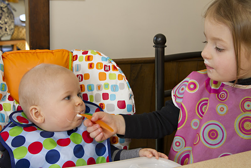 Cioci Kimmy called me up at work today and said 'I'm going to feed your kid some yogurt for the first time'. I was a little apprehensive about it because we had just introduced apples to AJ's diet and with the three day rule, I wasn't sure if we should or not. But Kimmy did it anyway and I was hoping for the best! I was also a bit bummed because I wasn't there to see his reaction - stupid work! - but lucky for me, Cioci Kimmy was able to capture his reaction and even the helper who was feeding him!