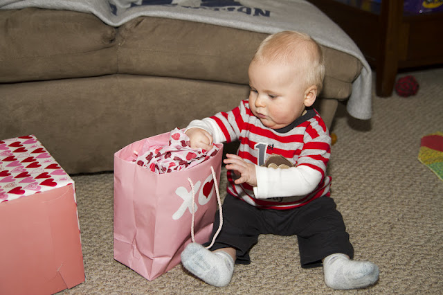 AJ got to spend the majority of the day with Grandma and Grandpa because it was a Tuesday and that's Mommy's long day at work. But once Mommy and Daddy got home, we opened up Valentine's Day presents! AJ first opened up the gift from Mommy and Daddy and then we moved on to Babcia and Dziazdi's present... (we had opened Grandma and Grandpa's gift last week!!)